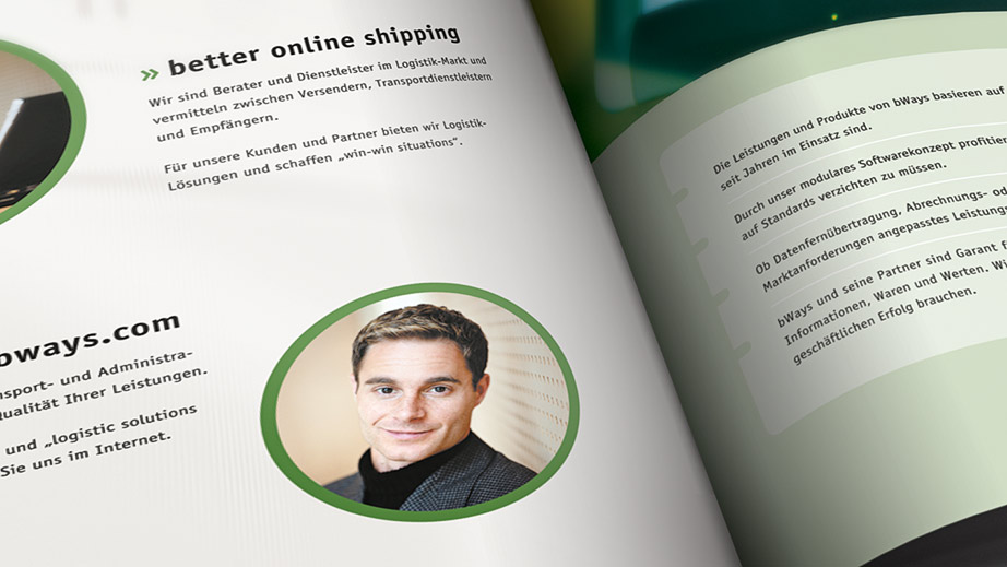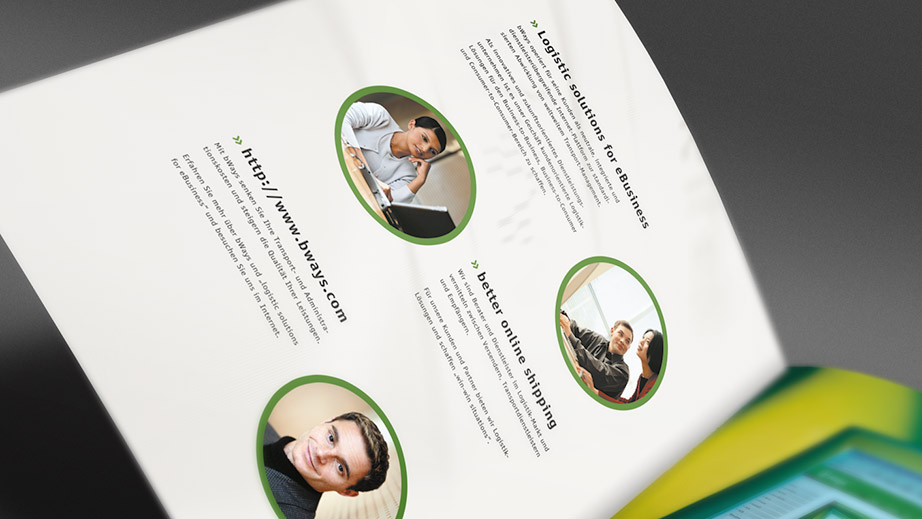 Für die Shipping-Plattform bWays aus dem Hause Bertelsmann gestalteten wir einen Imagefolder, der auch als Präsen-tationsmappe genutzt werden kann. Der Innenteil bietet Platz für Inlays und eine Visitenkarte.