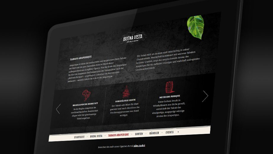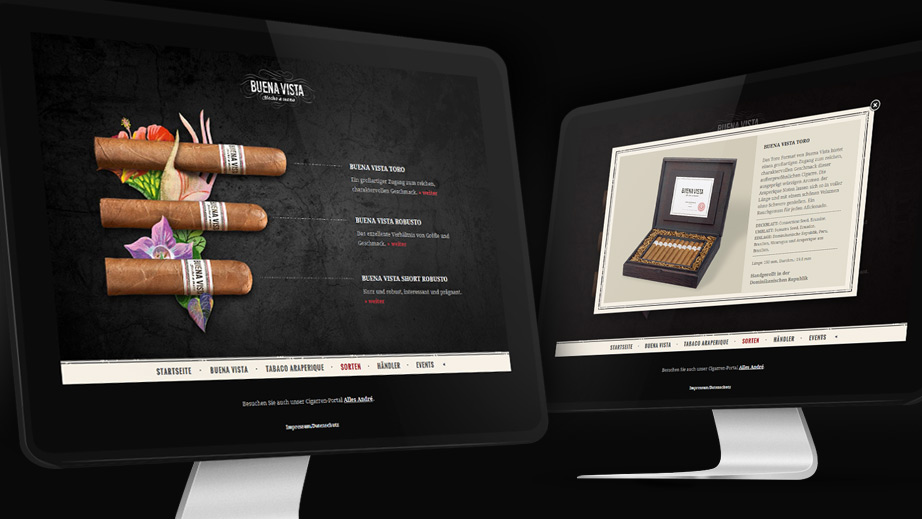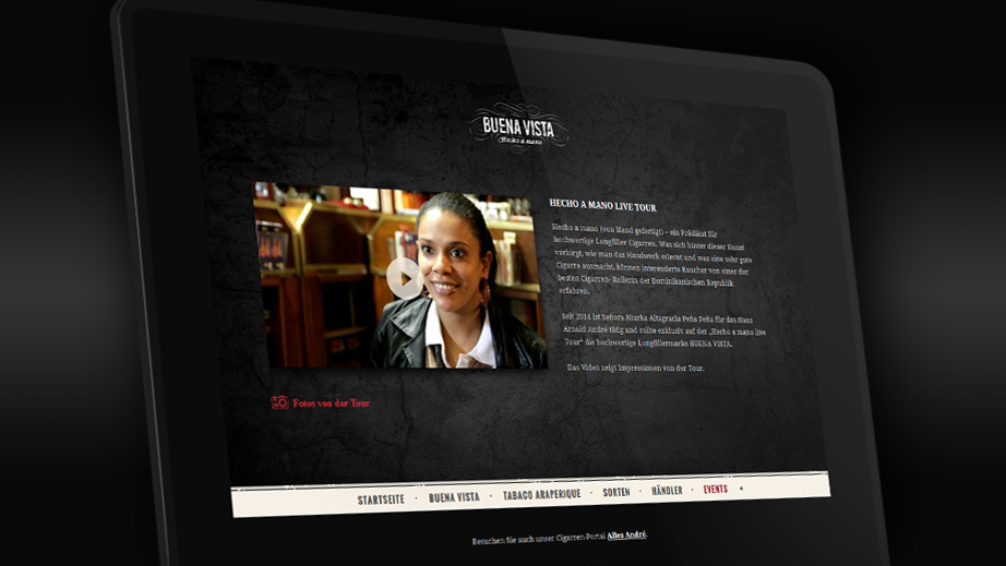 Buena Vista steht für handgemachte Cigarren. Auf der Microsite erfährt man mehr über die Marke und hat die Möglichkeit, ein Video sowie Fotos von der „Hecho a mano Tour“ zu sehen sowie nach Händlern vor Ort zu suchen.