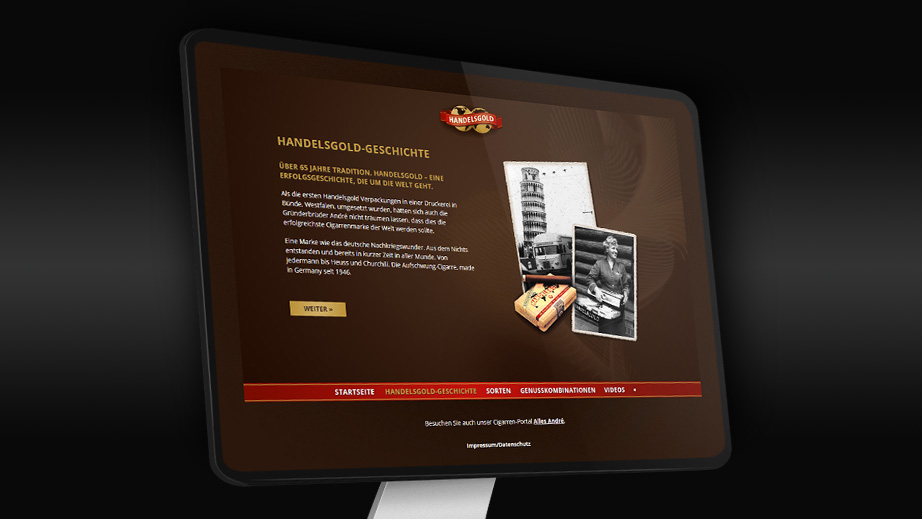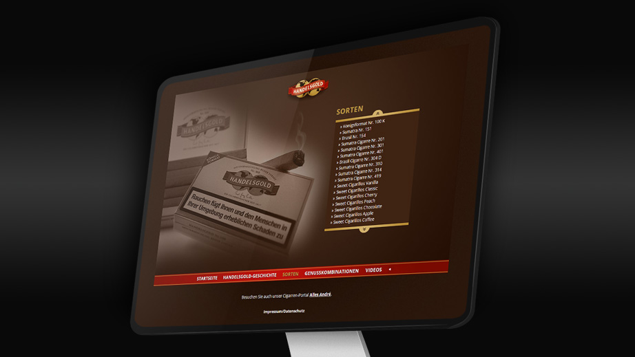 Wir gestalteten die Microsite für die traditionsreiche Marke Handelsgold aus dem Hause Arnold André und setzten diese im Responsive Design um. Neben Infos zur Geschichte findet man auch Videoclips aus dem Archiv der Aufschwungzigarre.