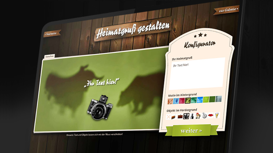 Mit dem von uns entwickelten Konfigurator können Heimatgrüße direkt auf dem Bildschirm gestaltet und in die Galerie übertragen werden.