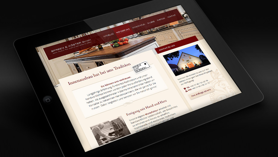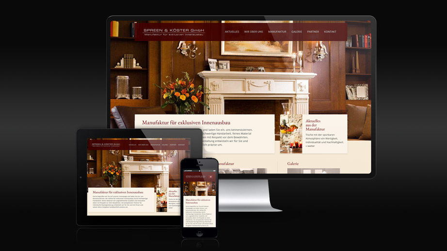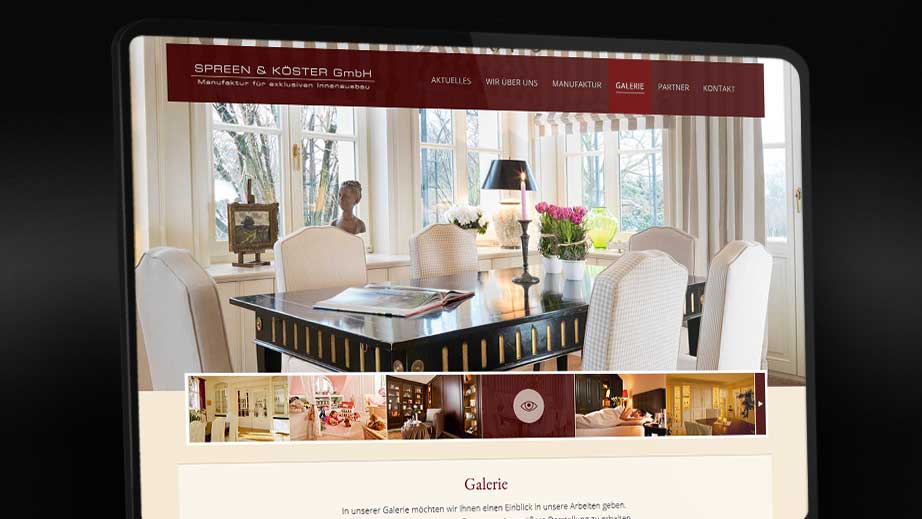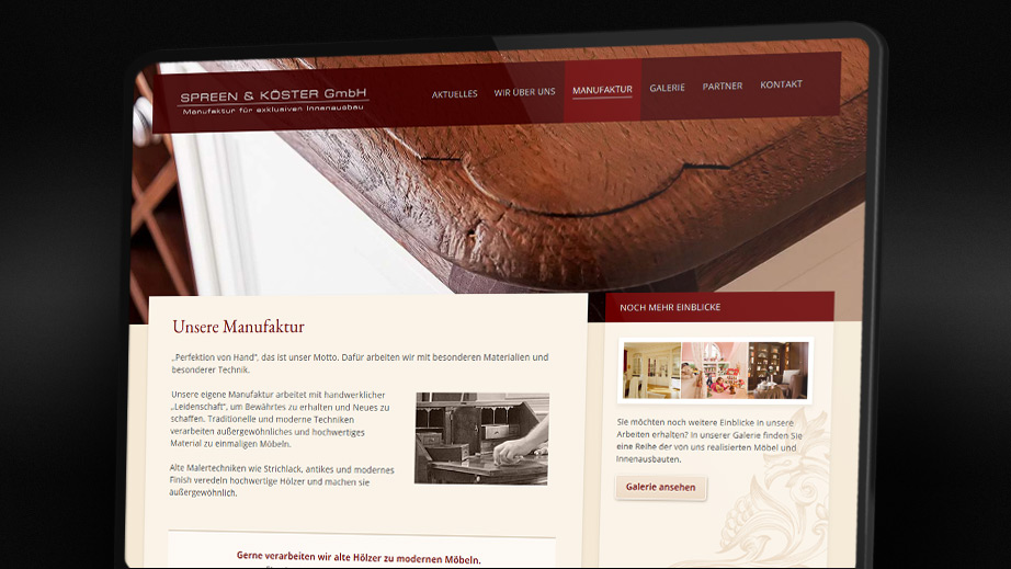 Für die exklusive Manufaktur Spreen & Köster entwickelten wir eine elegante Website, die das Unternehmen, die Arbeiten und die hochwertigen Inneneinrichtungen und Möbel stilvoll in Szene setzt.