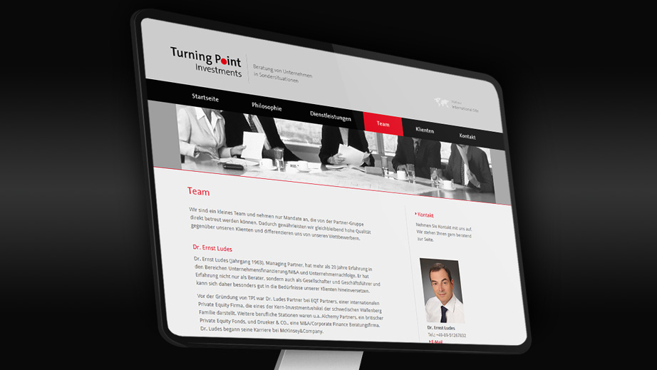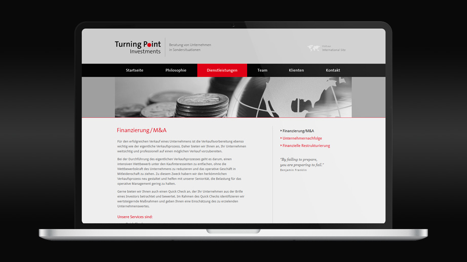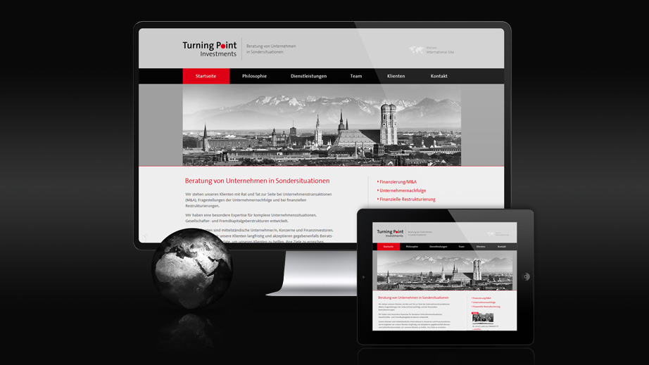 Zweisprachige Website (Deutsch und Englisch) für das in München und Aschau ansässige Investment-Unternehmen. Die hochwertige Gestaltung unterstreicht die Kompetenzen des Unternehmens im Bereich der Beratung von Unternehmen in Sondersituation.
